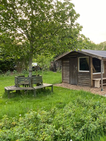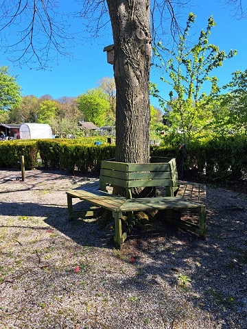 Het bankje dat voorheen rond een boom bij de Tuintreffer te vinden was, is verhuisd naar een boom direct rechts voorbij bij toegang tot het complex, daar waar je ook het mededelingenbord vindt. Het gras rond de Tuintreffer is zo beter te maaien.