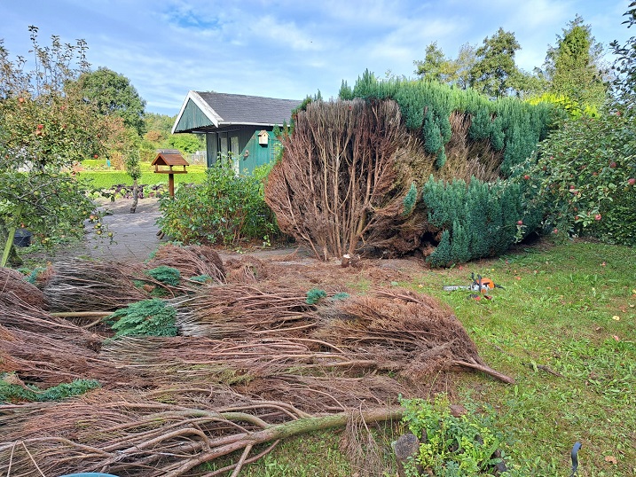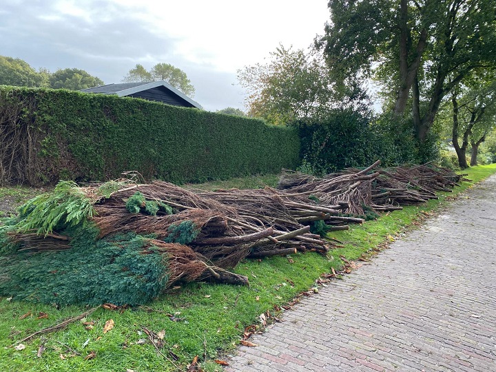 Tuinders van sector 10 hebben afgelopen zaterdag flink doorgepakt. Ze hebben een aardige verzameling coniferen naar het hoofdpad overgebracht. Deze waren een paar dagen eerder achter tuin 143 omgezaagd door Erik en Hananja.