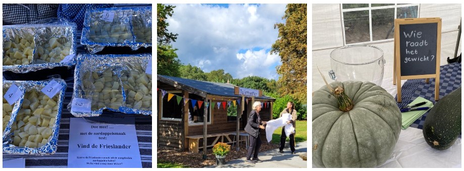 Tijdens het oogstfeest kon je verschillende soorten (biologische) phytophthora-resistente aardappelen proeven. De Connect (midden) werd veruit als lekkerst beoordeeld, daarna de Vitabella (vroeg), en als derde de Peter Pan (laat). De prijsvraag in welke schaal bevindt zich de Frieslander is geraden door Linda Ensing, op basis van uiterlijk.