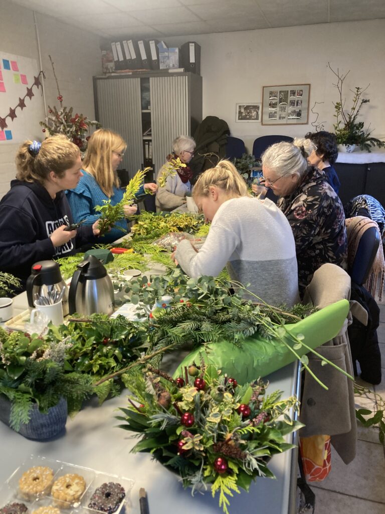 Met een kopje koffie en een kerstkransje zat de sfeer er goed in. De stukjes waren dankzij de ruime keuze van het groen snel klaar en kon er een eventueel tweede stuk gemaakt worden. Met een mooi kerststuk gingen de deelnemers later die ochtend naar huis.
