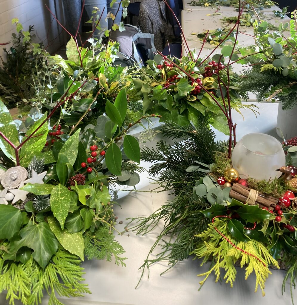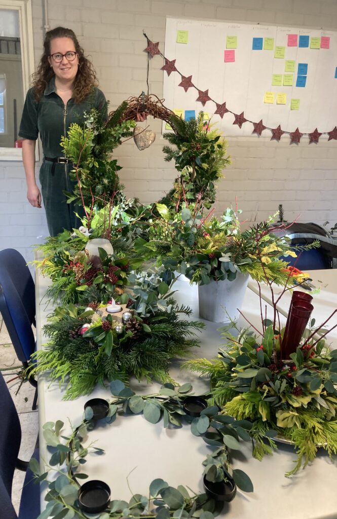 Nadat de oase op maat was gesneden ging ieder voor zich aan de slag. Een enkeling had een krans meegenomen die met groen werd omwikkeld. Dankzij het snoeiwerk in de singels was er ruim groen en ook bont blad voor handen. Het kerstgroen stond in emmers en lag op tafels in de loods. Er was bijvoorbeeld hulst, taxus, conifeer, kornoelje, wilgenkatjes, eonimus, skimmia, dennentakken enz. enz. De workshopleidster Engeltje had diverse kerststukken gemaakt die als voorbeeld dienden.