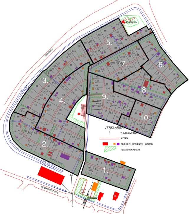 Plattegrond tuinen, bouwwerken, paden, sloten en groenstroken