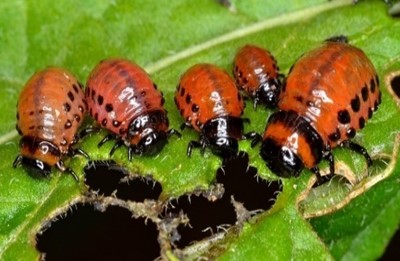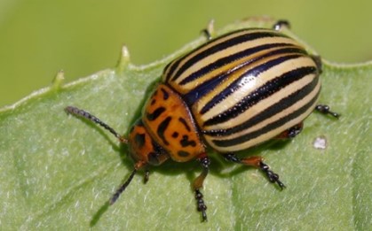 Een andere beruchte bedreiging voor de aardappelteelt is de coloradokever. Deze is ongeveer 10 mm lang en 7 mm breed en te herkennen aan de zwarte strepen op het schild. Volwassen kevers knagen alleen stukjes uit de bladrand, maar de vraatzuchtige jonge larven eten het blad geheel op. Bij ernstige aantasting kan het zijn dat aardappelen onvolgroeid blijven waardoor de oogst als verloren moet worden beschouwd. Als tuinder ben je verplicht de coloradokever actief te bestrijden.