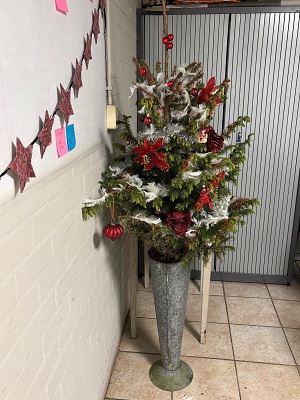 In de aanloop naar de kerst en meer concreet in de aanloop naar de workshop Kerststukjes maken is de kantine in kerstsfeer gebracht.